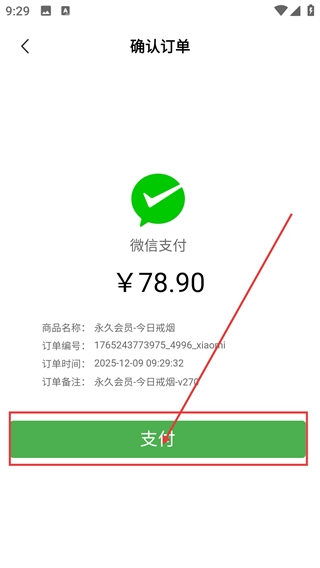 在确认订单页面核对好相关信息后,点击【支付】按钮,即可通过微信支付完成会员购买流程。