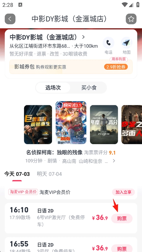 进入详情页面后,选择观影的时间、地点、版本以及影城名称等信息。