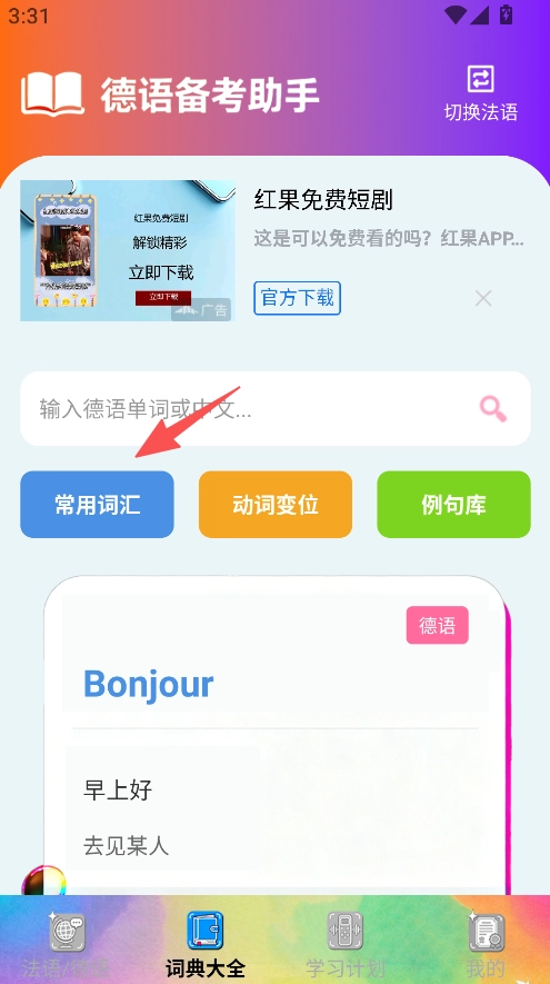 支持德语、法语等多语言切换功能,设有常用词汇等板块,可覆盖语言学习过程中与词汇相关的各类需求。