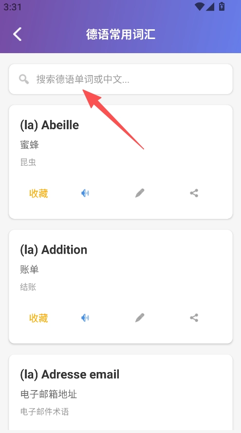 《zlet单词工具箱》属于语言学习类软件,具备德语与法语的切换功能,设有搜索栏供用户查询单词或中文内容。软件包含常用词汇、动词变位、例句库三大板块,其中常用词汇板块会呈现单词的释义及类别,用户可对单词进行收藏、聆听发音,点击对应按钮还能添加笔记并跳转至笔记页面,能够满足语言学习过程中词汇查询、积累以及记录的各项需求。