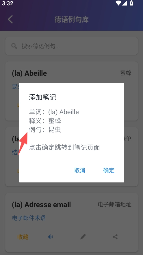 该功能支持添加笔记,点击单词对应的按钮,确认后会跳转到笔记页面,以便记录相关内容。
