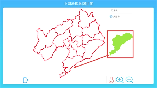 进入【辽宁省】有界拼图页面后,把右侧的区域块拖到地图的对应位置,就能完成该区域的拼图匹配操作。