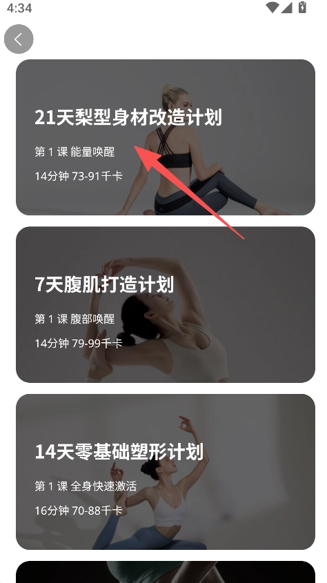 拥有课程浏览的功能,进入课程板块后,可查看高效燃脂计划里各个阶段的课程信息。