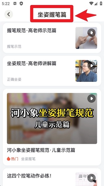 进入「坐姿握笔篇」后,你可以观看握笔规范、坐姿讲解、儿童演示等不同类型的示范视频,从而更好地掌握正确的书写姿势。