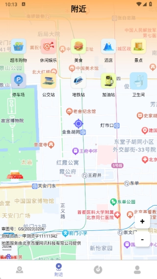 在周边页面中能够查询周边的超市购物、休闲娱乐、美食、酒店、停车场、公交站点、地铁站点以及加油站等相关信息。