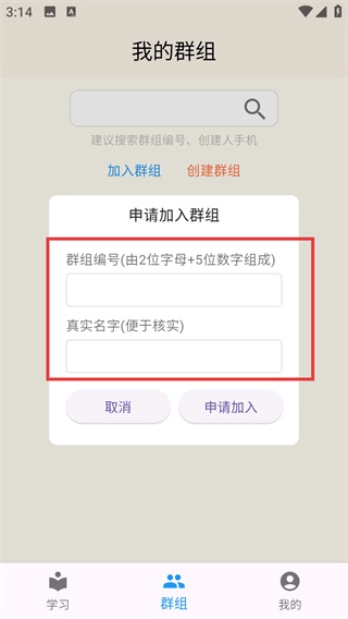 在我的群组页面点击【加入群组】选项后,会弹出申请加入群组的信息填写窗口。