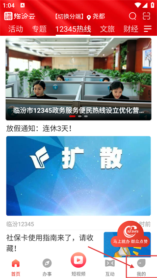 1、在【临汾云】首页,点击底部的【我的】选项,就能进入个人中心页面,这是进行账号相关操作前需要完成的步骤。