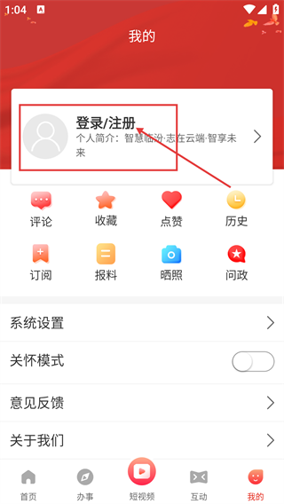 2、进入【我的】页面后,点击【登录/注册】区域,即可进入账号登录或注册界面,继续完成账号绑定流程。