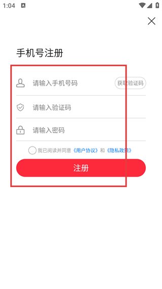 4、进入【手机号注册】页面后,按顺序填写【手机号码】、【验证码】和【密码】,接着点击【注册】按钮,即可完成账号注册操作。