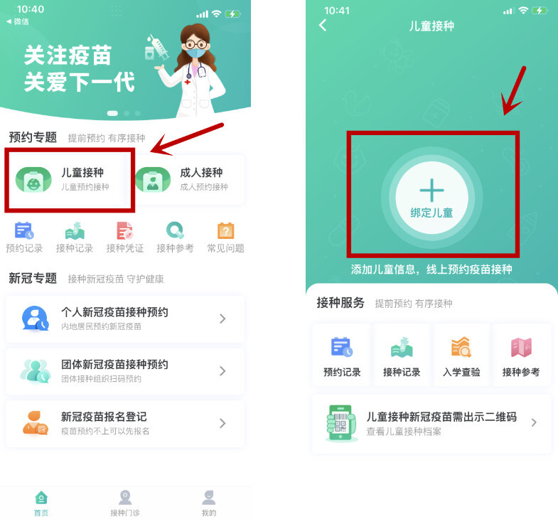 第三步 认证成功后,返回首页点击【儿童接种】选项,完成儿童信息的绑定操作。