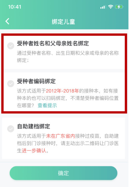 在广东省内接种过疫苗的,建议优先选择第二个选项【受种者编码绑定】;要是接种本上找不到编码,就选第一个选项【受种者姓名和父母姓名绑定】。而未在广东省内接种过疫苗的人员,请点击【自助建档绑定】选项。