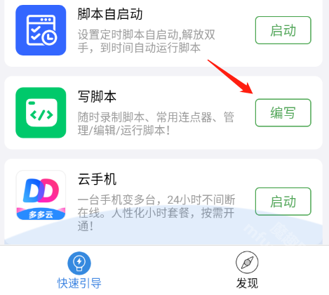 1. 启动按键精灵手机版,找到“写脚本”功能选项,点击其右侧的“编写”按钮。