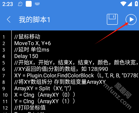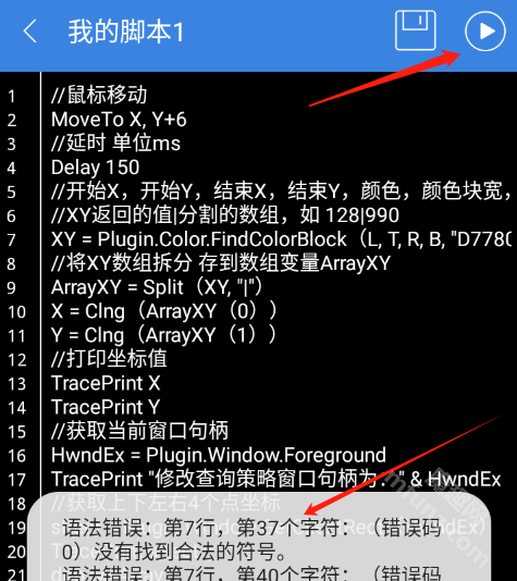 5. 为了给大家做演示,我写了一段简单的游戏脚本代码供参考。代码编写完成后,点击页面右上角的“运行”按钮即可。