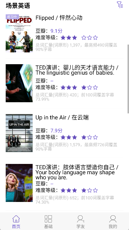 2、主界面配备了多样的视频学习资料,涵盖电影片段、对话实录等类型,用户能够自主挑选。