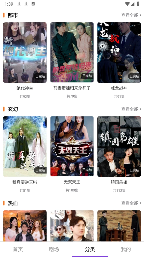 进入首页后,平台提供了丰富多样的短剧资源分类,涵盖都市、玄幻、热血等不同类型。
