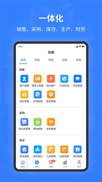 1、智邦ERP手机版达成一体化管理目标,整合办公与管理的全部功能,覆盖从客户信息录入到业务报表生成等各类场景,用户登录后即可体验全场景的无缝衔接。