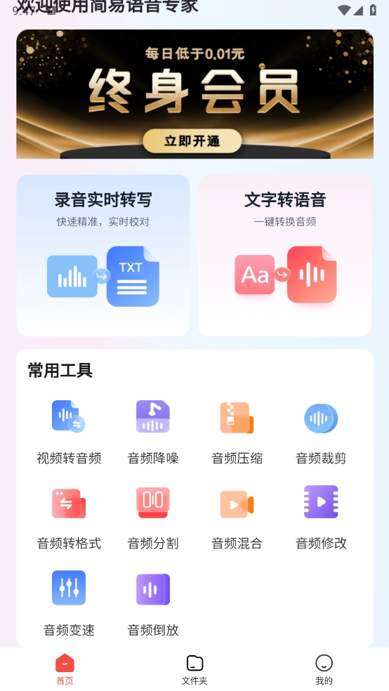 进入首页后,你可以看到录音实时转写、文字转语音功能,以及常用工具板块。