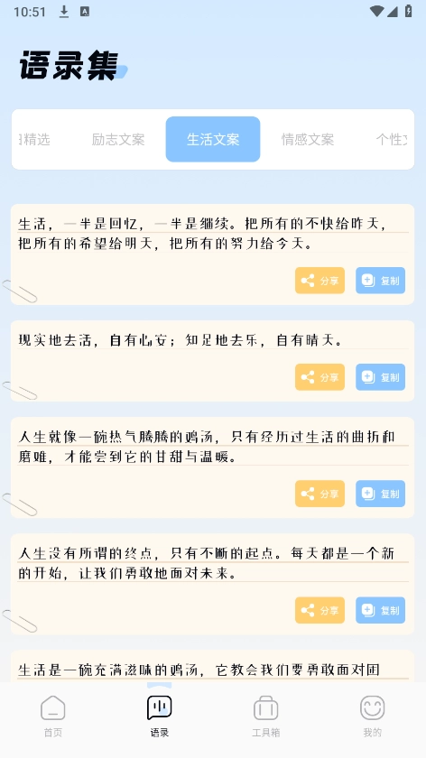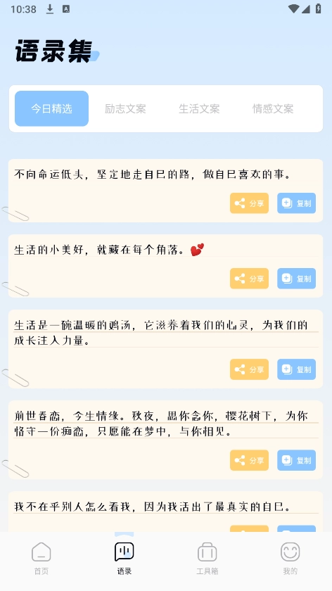 3、精选语录:无论您是想找能激励自己的励志文字,还是要为朋友圈挑选感人至深的情感语录,这里都能满足您的需求。
