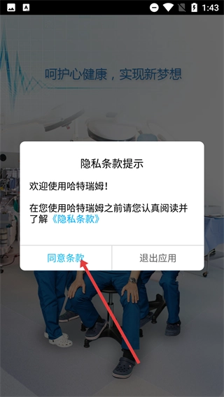 1、在隐私条款提示弹窗里阅读完《隐私条款》后,点击【同意条款】按钮,即可进入哈特瑞姆的引导页面。