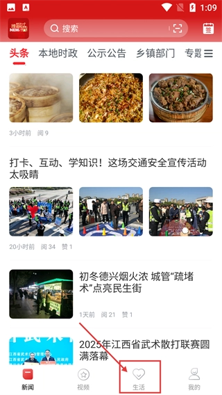 在新闻资讯页面时,点击底部导航栏中的【生活】选项,就能进入对应的生活服务页面,之后可以使用各类便民功能。