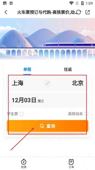 3、进入火车票预订界面后,把行程地设置为【上海】到【北京】,确定出行日期为【12月03日】,接着点击【查询】按钮就能看到相应的车次信息。