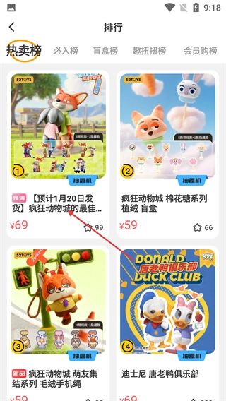 2、进入热卖榜页面后,能看到排名第一的商品是【疯狂动物城的最佳拍档】,其售价为【69元】,点击该商品即可进入对应的【抽盒机】界面。
