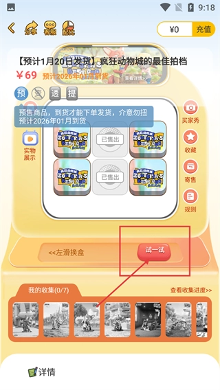 4、进入【试一试】界面后,找到展示的【疯狂动物城的最佳拍档】盲盒,根据提示【请随机选择一个盲盒】执行相应操作。