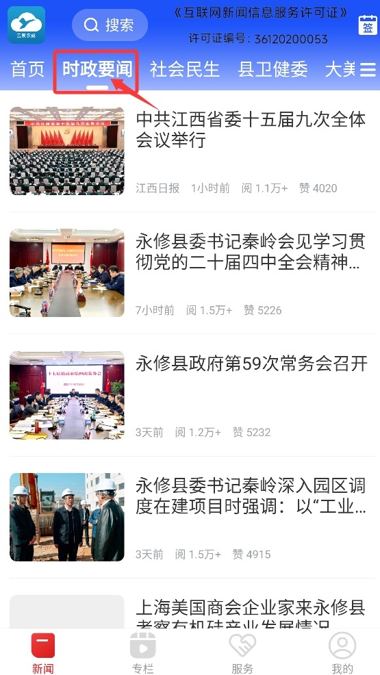 打开云聚永修应用后,您能借助搜索文章的功能,迅速找到本地新闻、政策解读或者特定事件的相关报道。