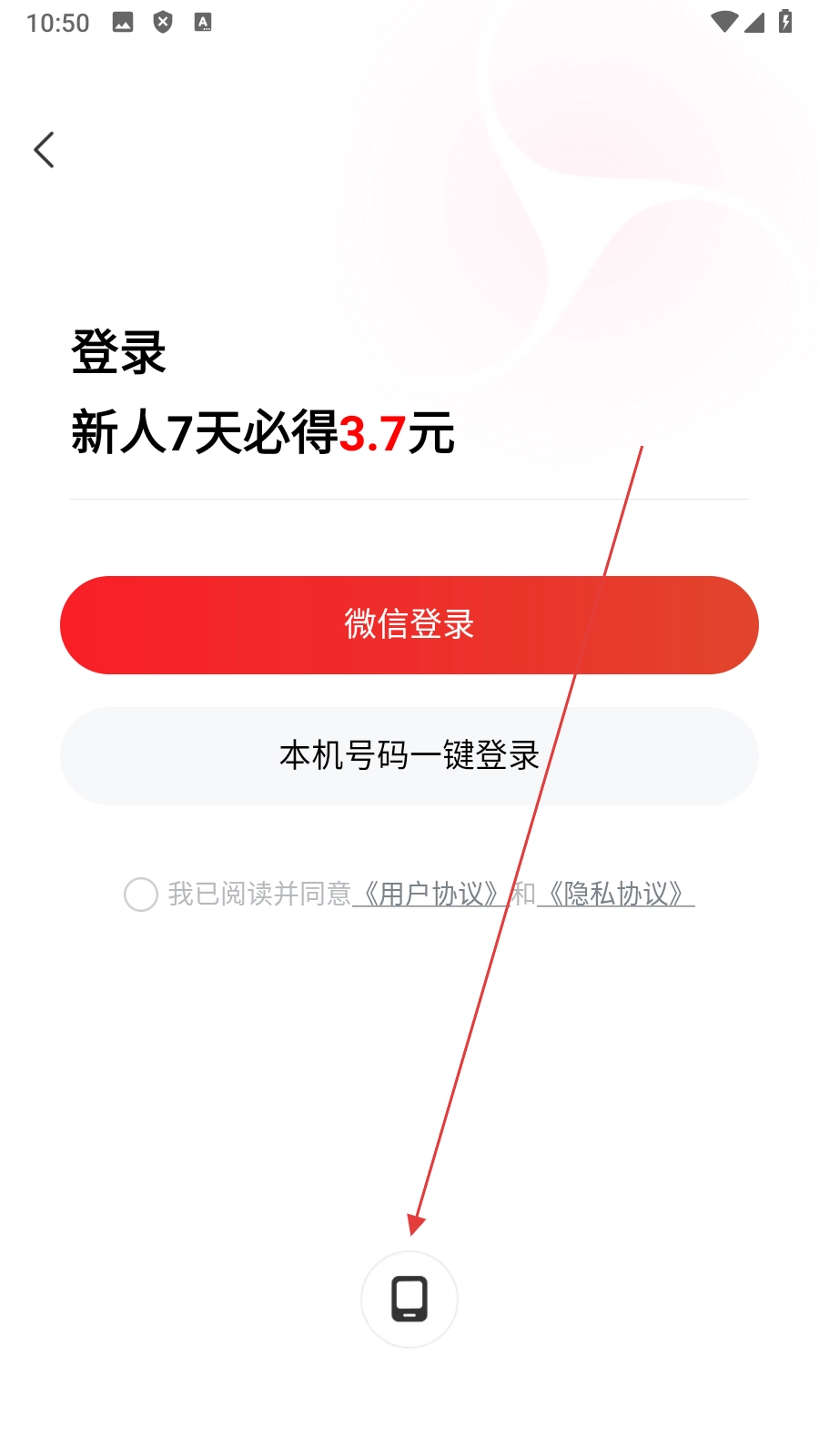 3、在登录方式选择页面,点击【手机图标】,进入手机号登录页面。
