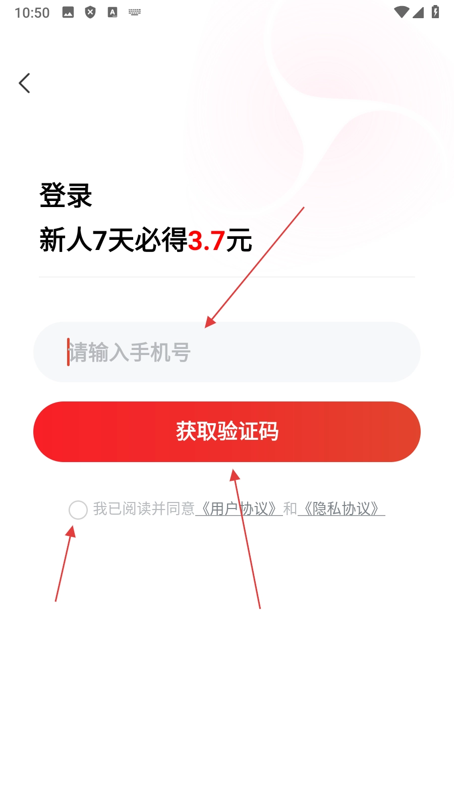 4、在手机号登录页面完成【勾选协议】和【输入手机号】的操作后,点击【获取验证码】,就能完成登录流程。