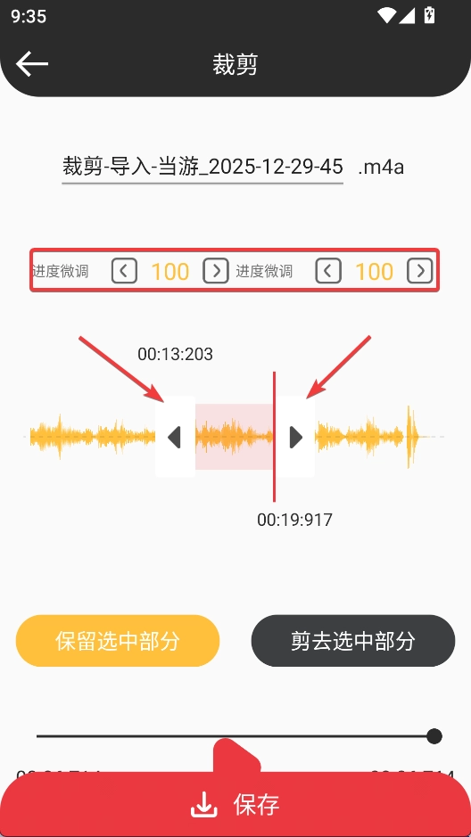 3、通过按钮和滑块精细调整选中的片段以完成裁剪