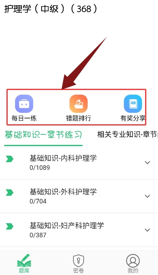 2、题库界面提供每日一练、错题排行与有奖分享等功能。