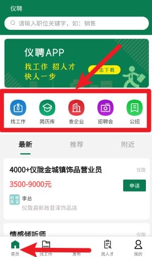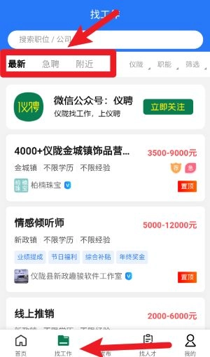 3、点击下方导航栏的“找工作”选项,借助最新、急聘、附近等筛选条件,就能精准查看岗位信息。