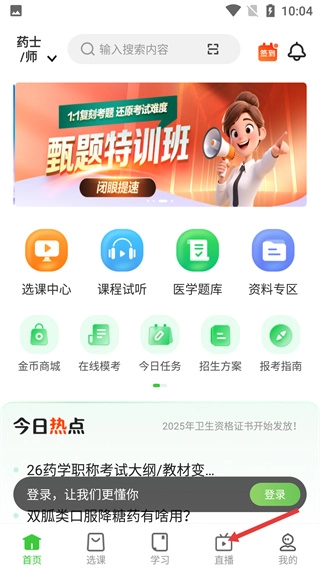 1、在药士/师首页,点击底部的【直播】标签,进入直播页面后,就能看到热门直播、直播课程等各类直播相关的内容模块。