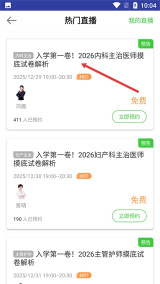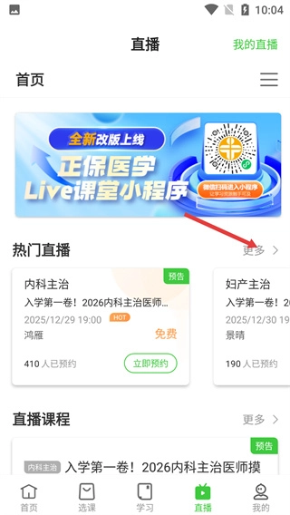 2、在直播页面,点击【热门直播】右侧的“更多”按钮,进入热门直播的完整列表页面,浏览各类直播课程。