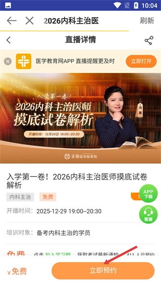 4、进入直播详情页面后,先核对直播相关信息,再点击页面底部的【立即预约】按钮,即可完成该直播课程的预约流程。