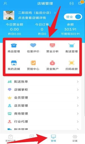 3、在管理页面可进行商品管理、信誉评价、营业分析、配送管理等核心经营操作。