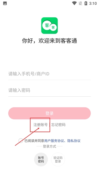 2、在【客客通】的登录页面,可填写【手机号/商户ID】与密码登录,点击【注册账号】可进入注册流程。