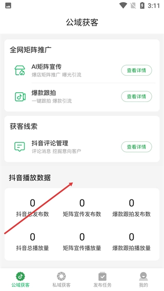 4、进入【公域获客】板块,可查看【AI矩阵宣传】【爆款跟拍】等工具详情,还能查看抖音相关的播放数据。