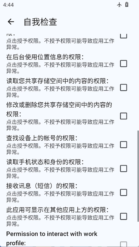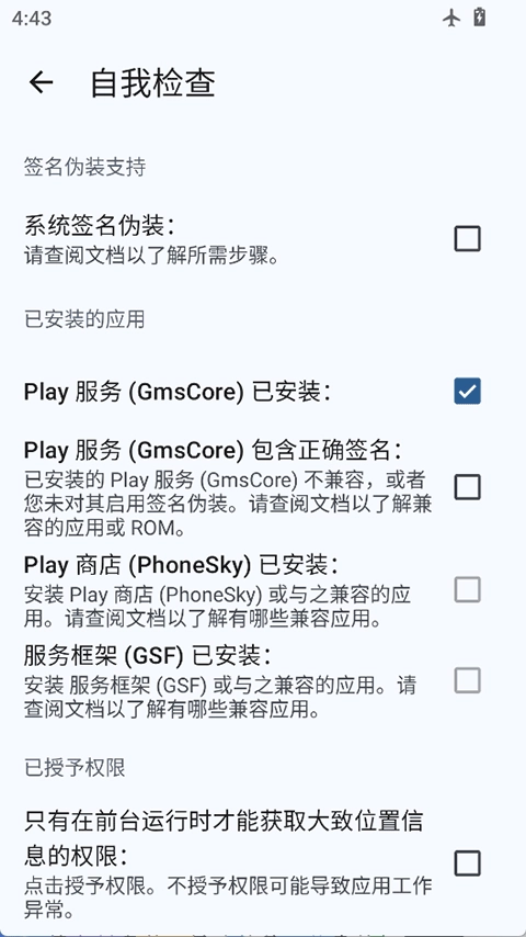 重启后第一次进入 microG setting 时,点击 Self-Check 会提示你进行授权,存储/电话/通讯录/定位等权限.直接授权即可