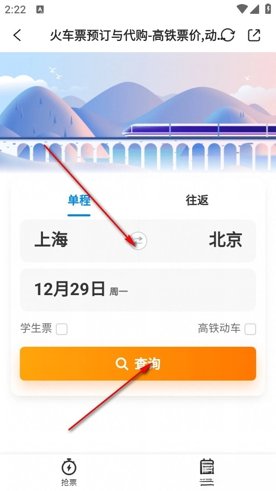 最后我们在火车票查询界面输入自己的起点站与去往的终点站就可以完成火车票查询了。