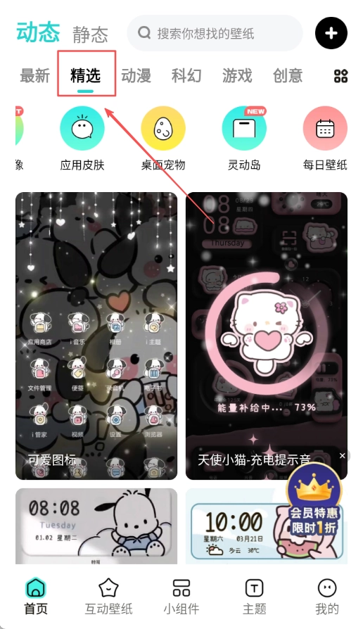 1、打开界面进入动态壁纸板块浏览各类资源,选择精选潮流等类别中的壁纸进行预览查看具体效果展示。