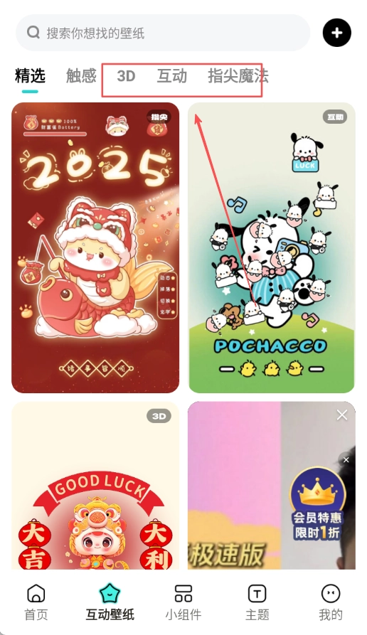 3、切换到互动壁纸板块浏览其他类型资源,可选择3D壁纸指尖特效类壁纸进行体验和操作设置应用。