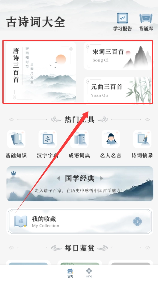 4、最后别忘了国学经典和我的收藏区域呢,喜欢的诗词都能存在这里慢慢看。