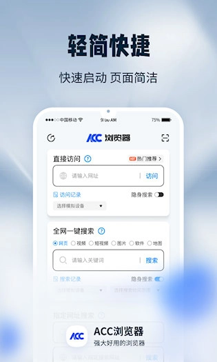 ACC浏览器是一款聚合型手机上网工具,整合了多个主流搜索引擎与多种内容类型,帮助使用者更高效地查找网页、视频、图片、软件、地图等信息,隐身浏览、模拟设备等功能,注重隐私保护与使用体验。