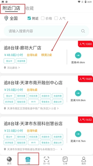3、点击底部的“门店”选项,进入附近门店页面后,就能查看各个台球门店的价格、桌数、距离等信息,进而挑选合适的门店进行消费。