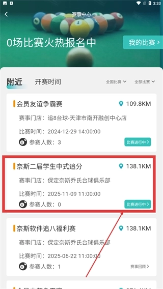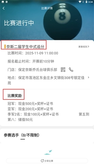 3、平台还具备台球赛事报名功能,用户能够随时知晓各类台球比赛的信息并完成报名,借此与来自全国各地的球友切磋球技。