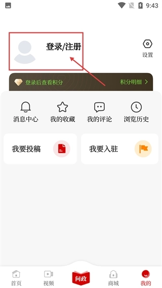 2、进入【我的】页面后,找到页面上方的【登录/注册】入口,点击该入口即可启动账号登录或注册流程。