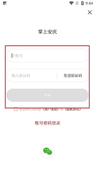 3、进入【掌上安庆】的验证码登录页面后,先填写【手机号】,点击【发送验证码】按钮,接着勾选相关协议,最后输入收到的验证码就能完成登录操作。