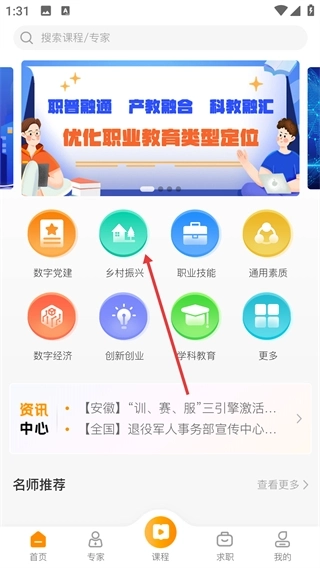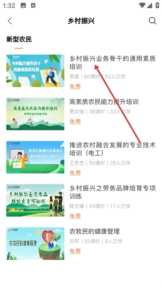 2、在主界面找到并点击【乡村振兴】功能选项,即可进入该分类对应的课程列表页面。
